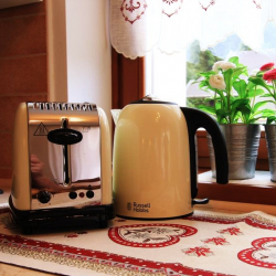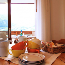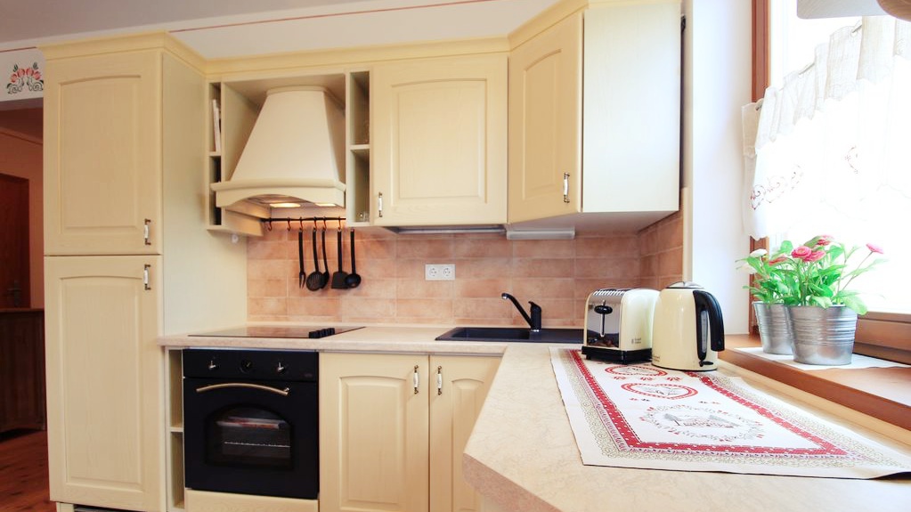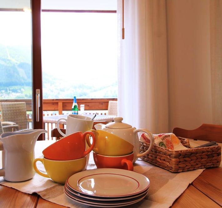 A nagy nappalival egybenyitva található a teljesen felszerelt konyha, amiben kényelmesen lehet akár főzni is, ha szeretnétek a házban étkezni. Étkészletek és evőeszközök, valamint vízforraló és kenyérpirító is a konyha részét képezi, és persze az elmaradhatatlan kilátás, ami az apartman legfőbb vonzereje.